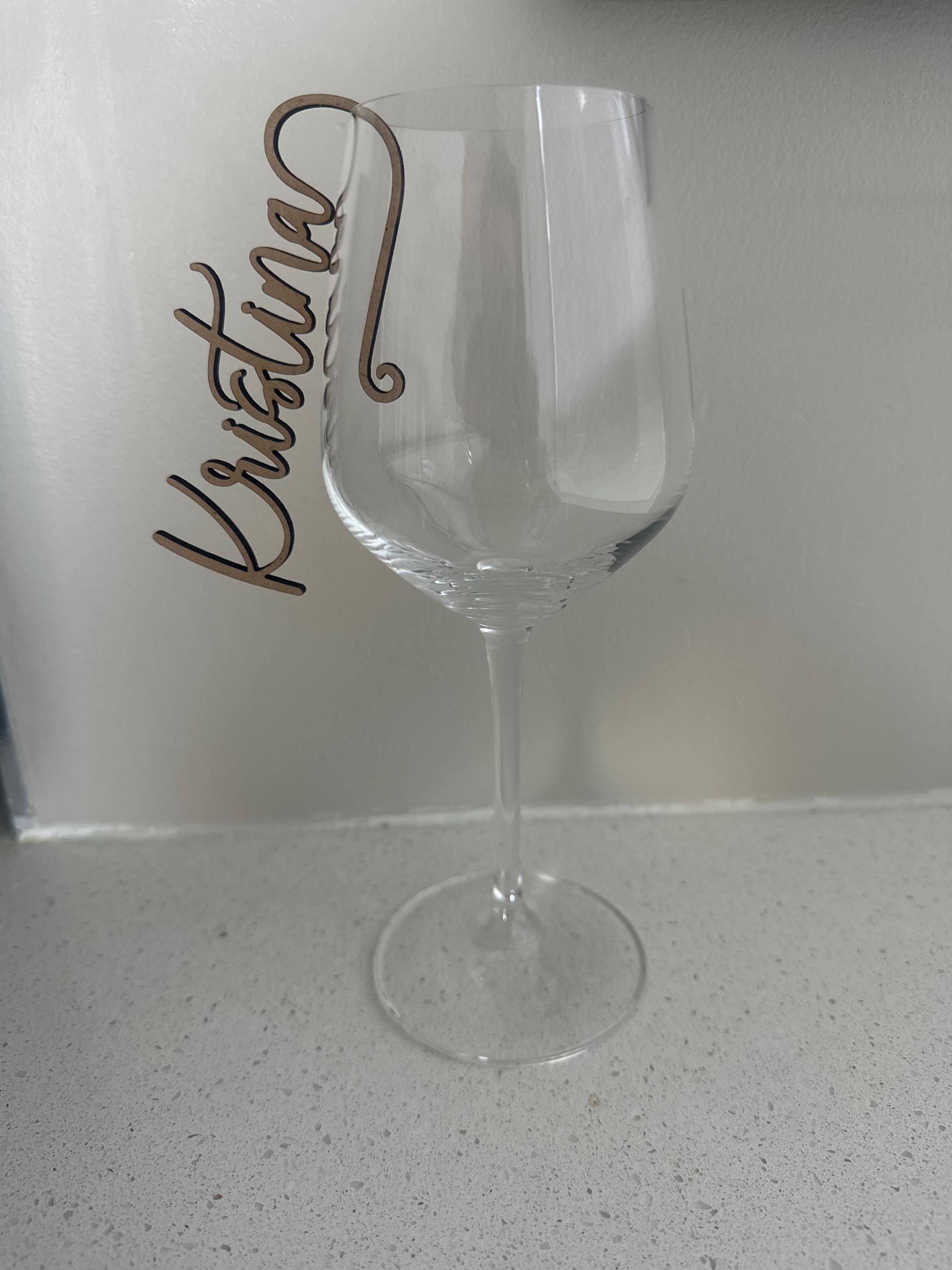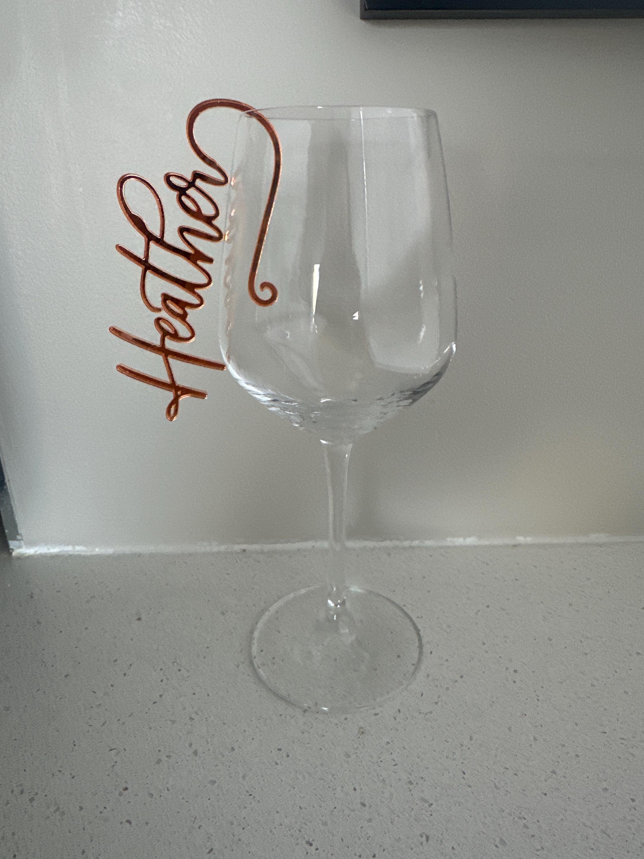 Elegant personalized wine glass charms for weddings and events. Custom laser-cut name tags for cocktails, champagne, or wine glasses.