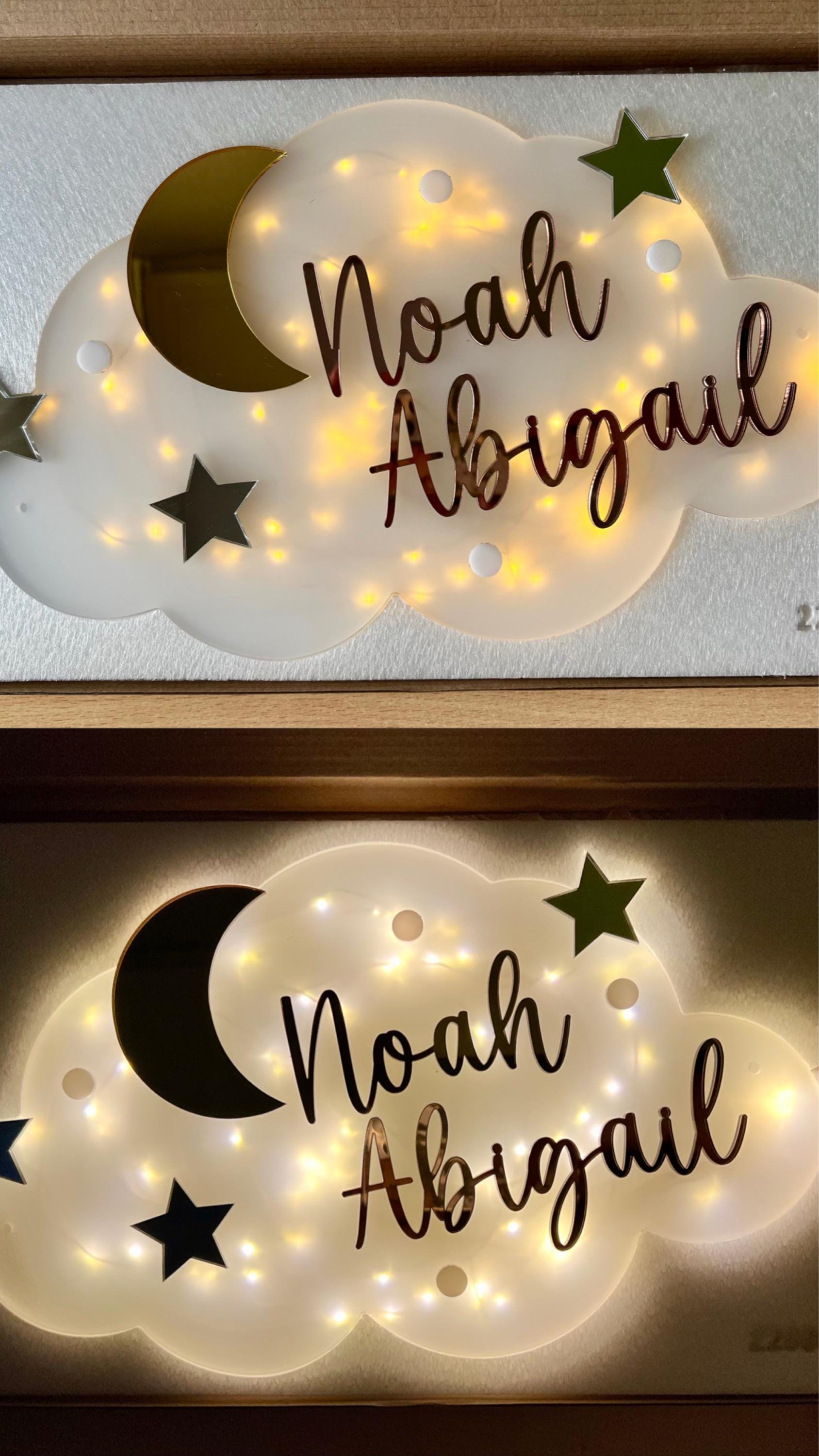 The baby name in front is cut from 1/8" thick acrylic in different colors.