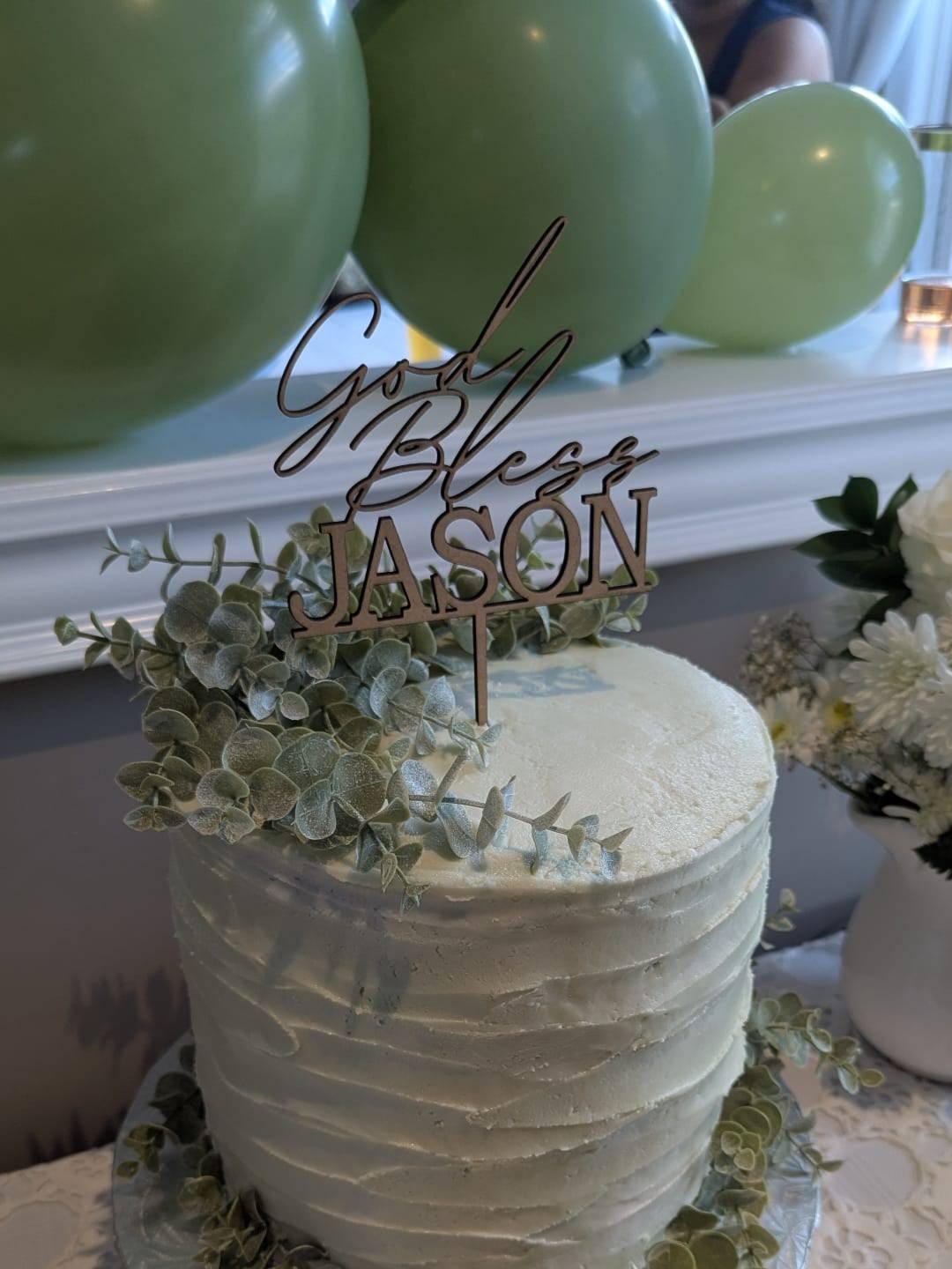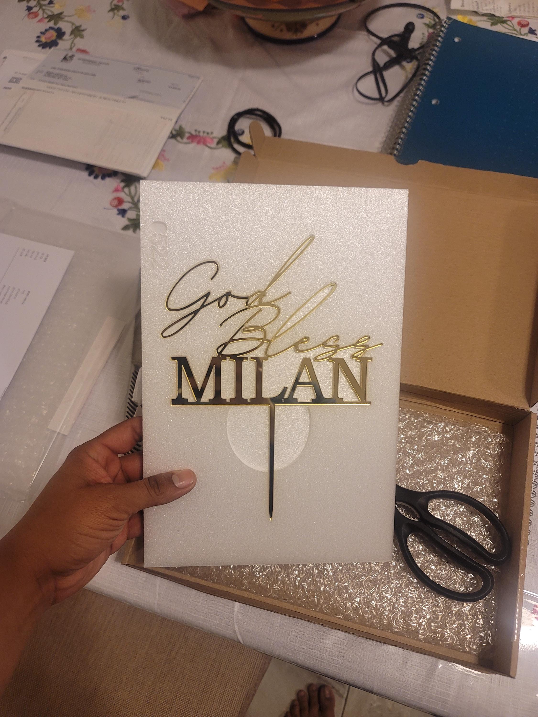 This listing is for a personalized cake topper with a custom name and text God Bless on the top.