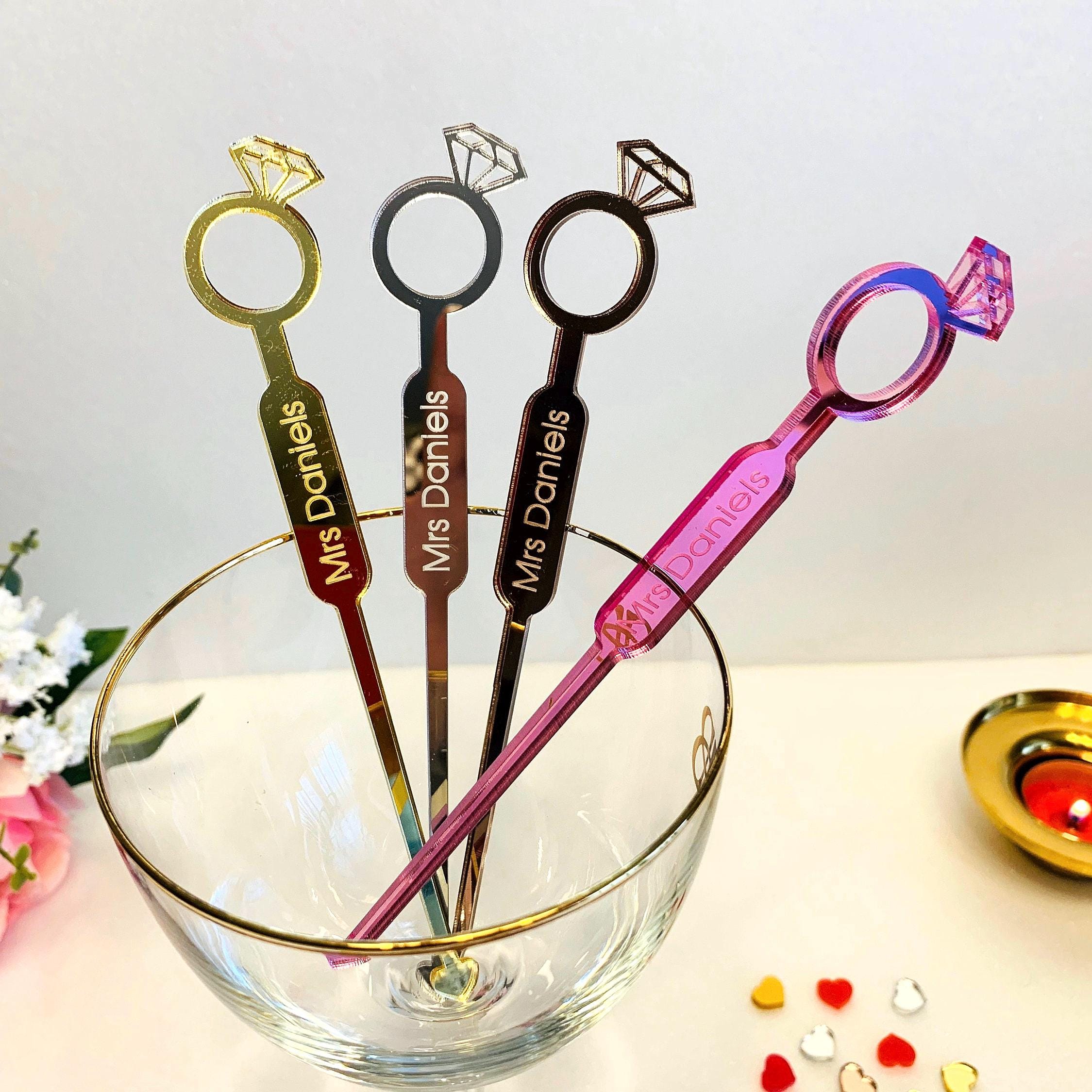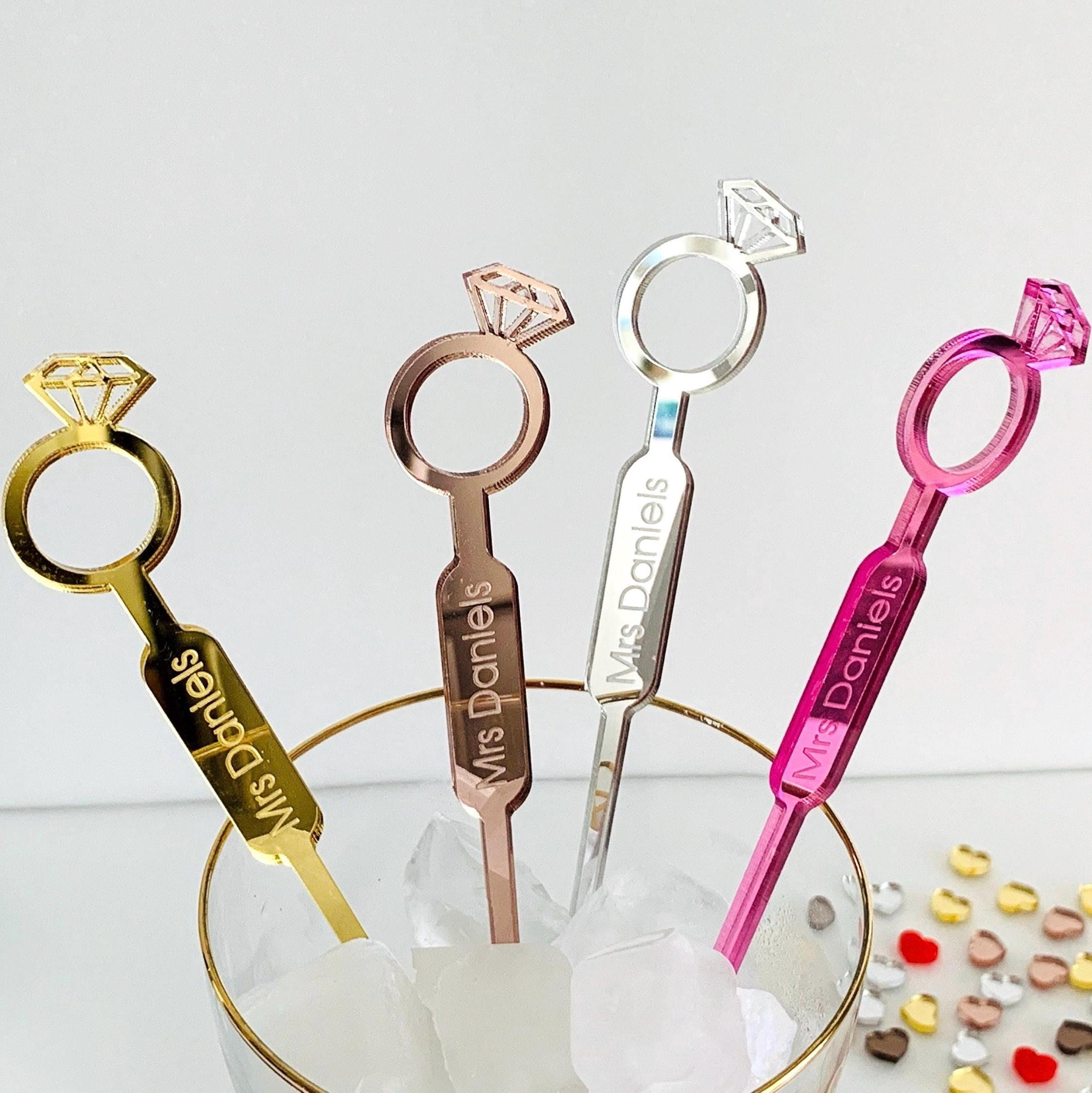 Personalized diamond ring cocktail stirrers with custom engraved names.